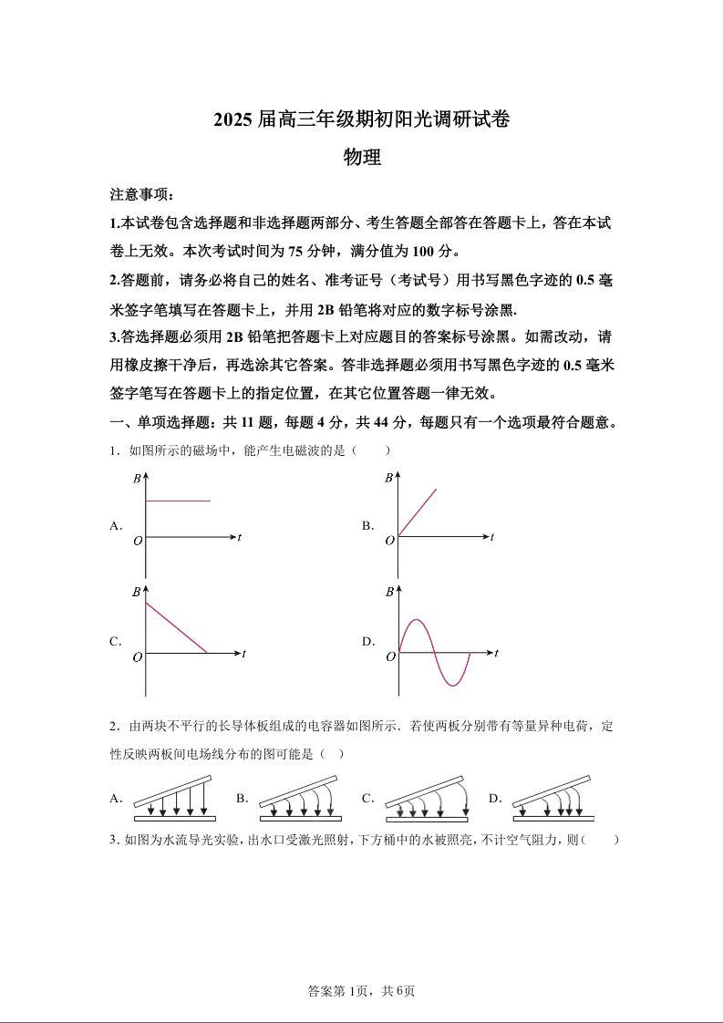 江苏省苏州市2025届高三年级期初阳光调研试卷 物理