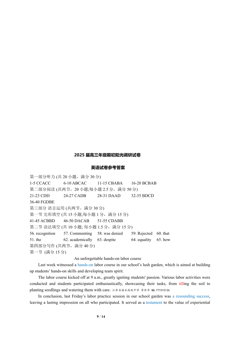 江苏省苏州市2025届高三年级期初阳光调研试卷 英语答案