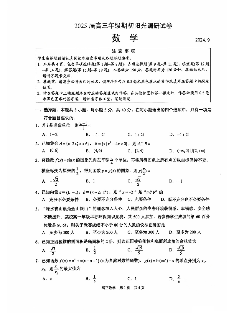 江苏省苏州市2025届高三年级期初阳光调研试卷 数学
