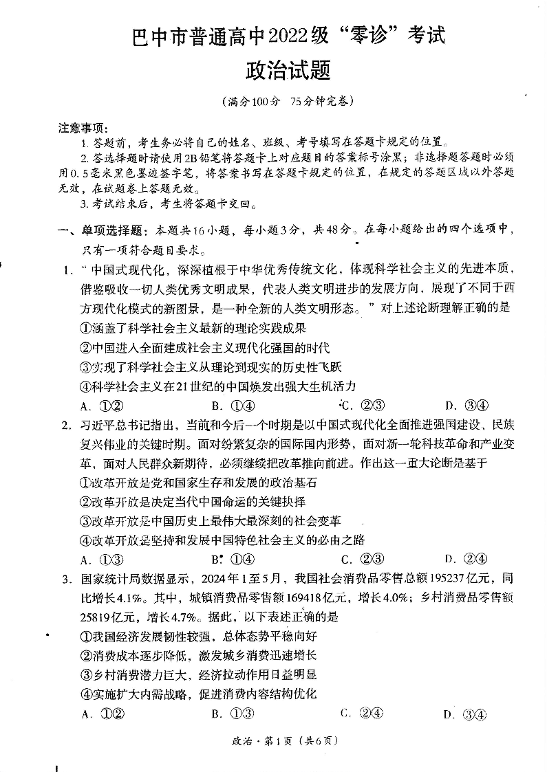 2025届四川省巴中市高三“零诊”考试 政治