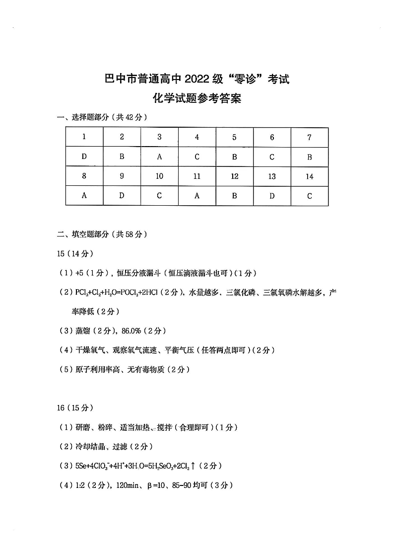 2025届四川省巴中市高三“零诊”考试 化学答案