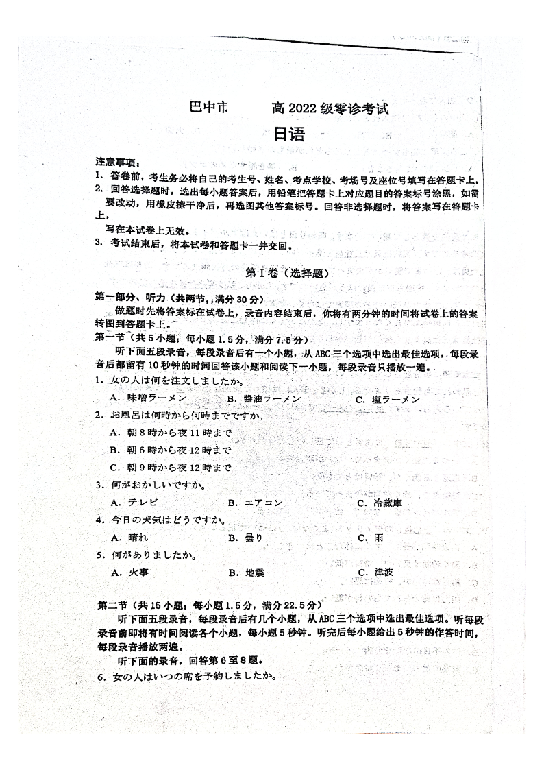 2025届四川省巴中市高三“零诊”考试 日语