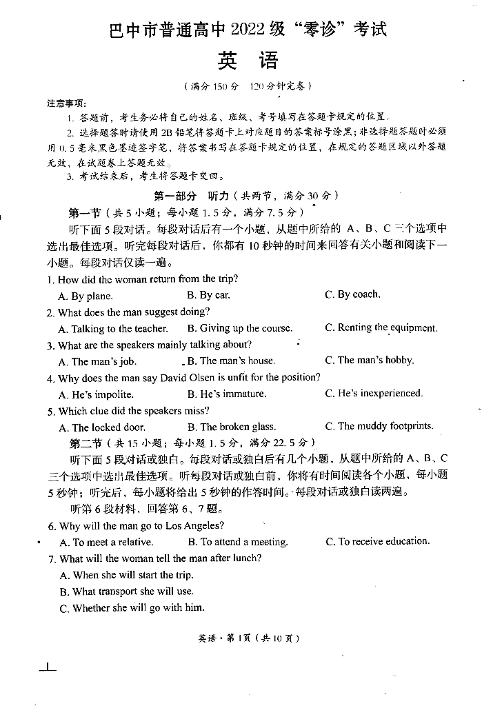 2025届四川省巴中市高三“零诊”考试 英语