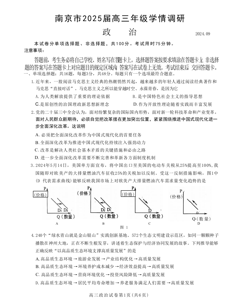 江苏省南京市2025届高三年级学情调研 政治