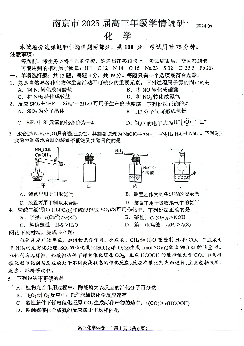 江苏省南京市2025届高三年级学情调研 化学