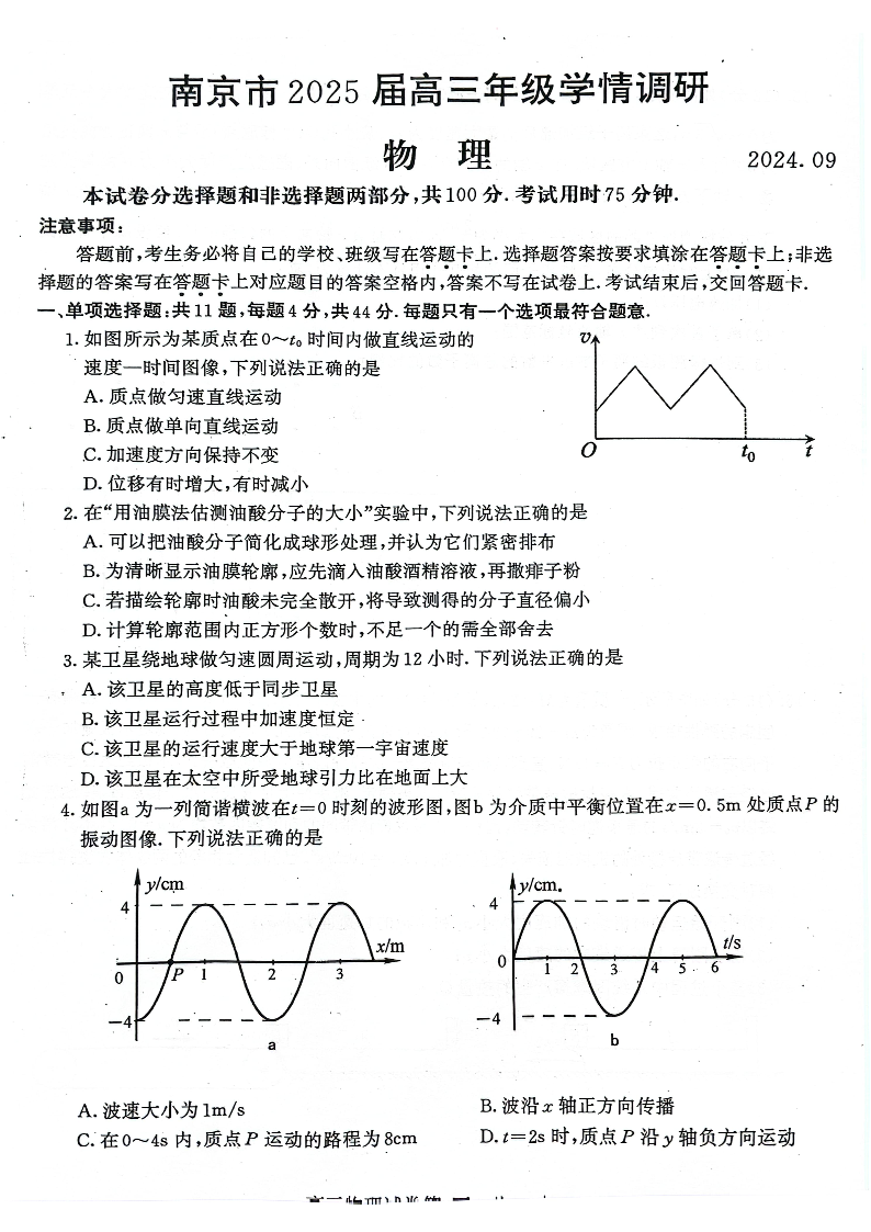 江苏省南京市2025届高三年级学情调研 物理