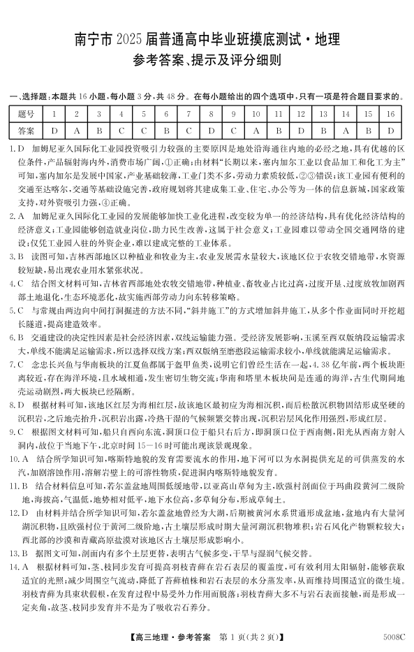 南宁市2025届普通高中毕业班摸底测试 地理答案