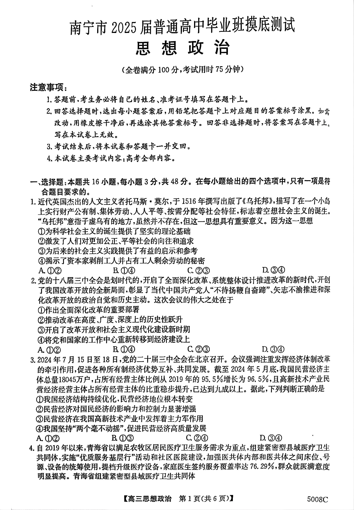 南宁市2025届普通高中毕业班摸底测试 政治