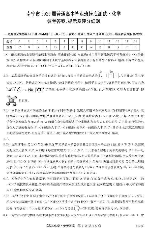 南宁市2025届普通高中毕业班摸底测试 化学答案