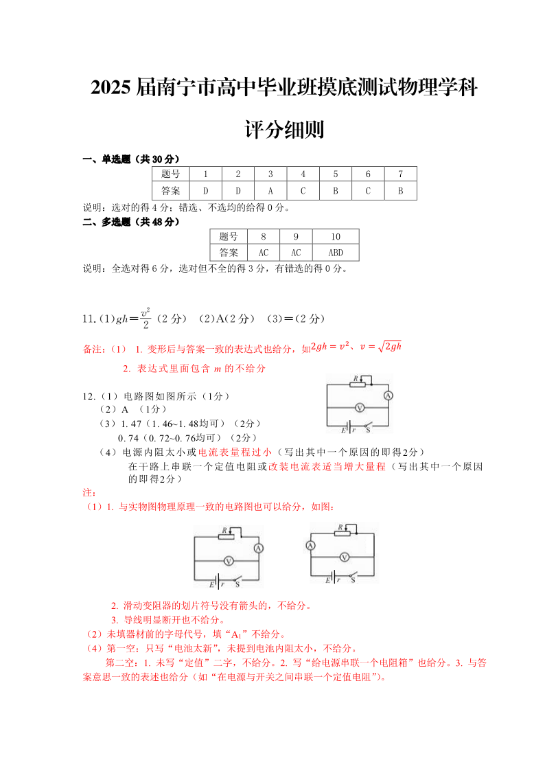 南宁市2025届普通高中毕业班摸底测试 物理答案