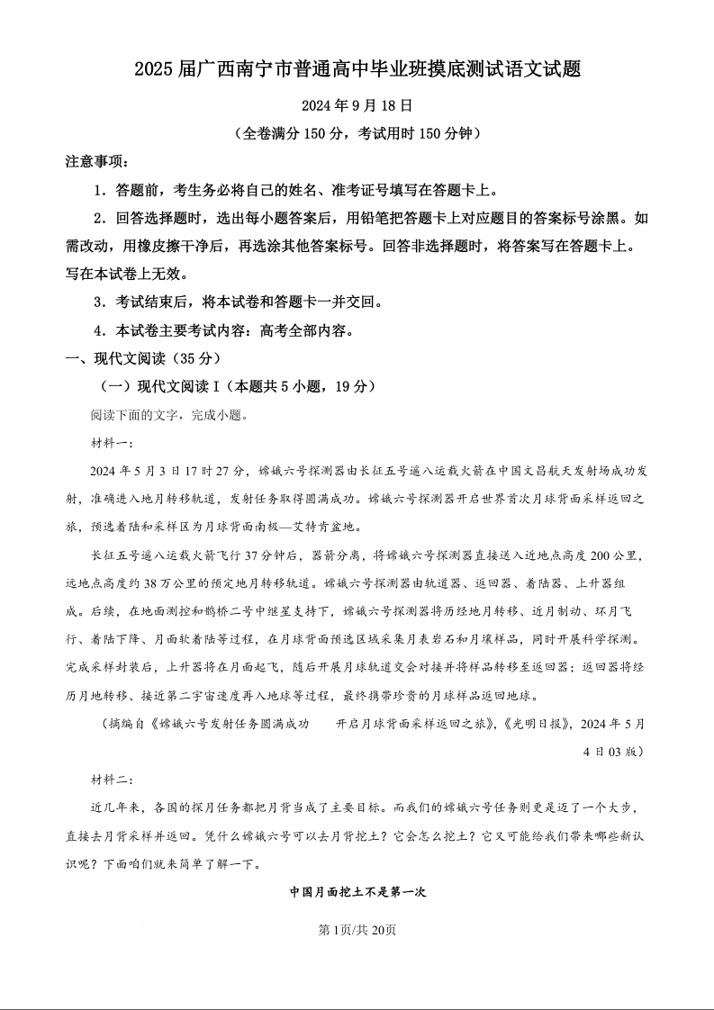 南宁市2025届普通高中毕业班摸底测试 语文答案
