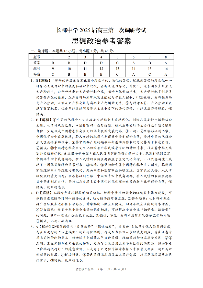 湖南省长郡中学2025届高三第一次调研考试 政治答案