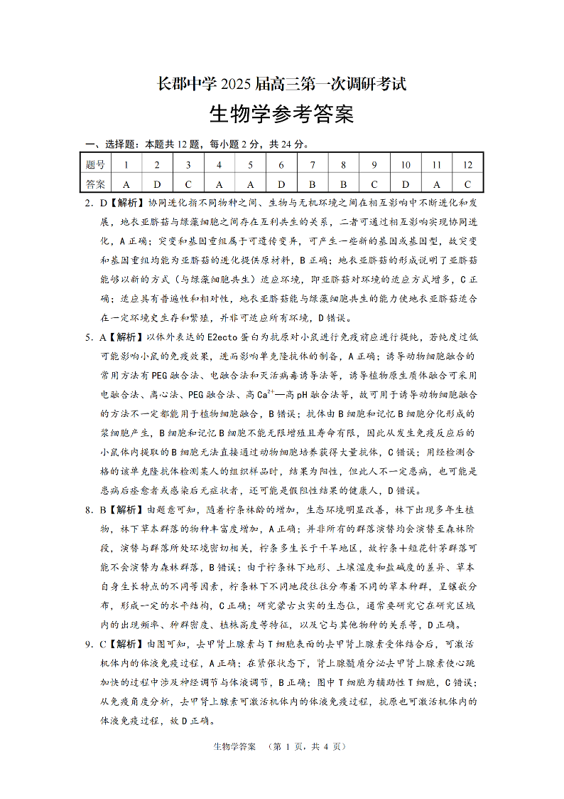 湖南省长郡中学2025届高三第一次调研考试 生物答案