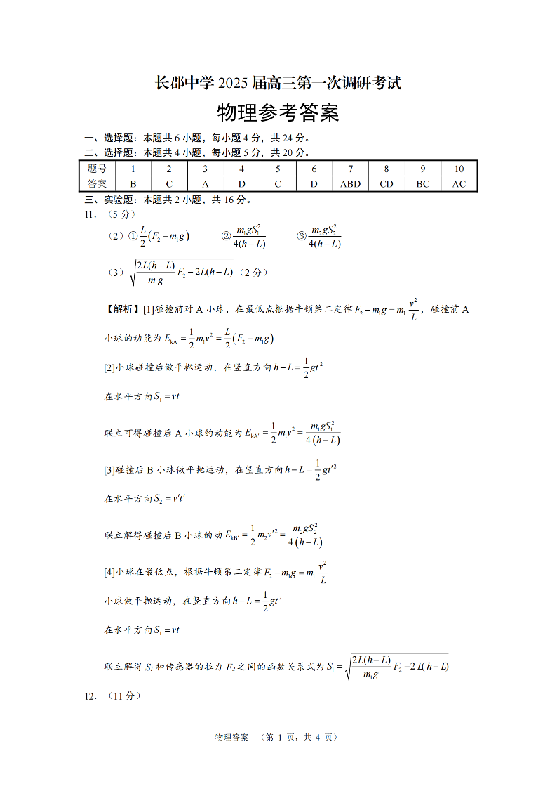 湖南省长郡中学2025届高三第一次调研考试 物理答案