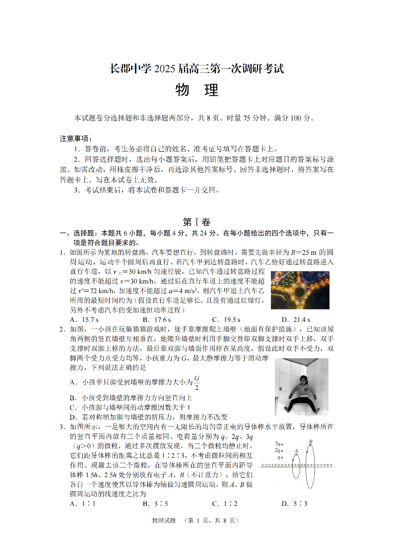 湖南省长郡中学2025届高三第一次调研考试 物理