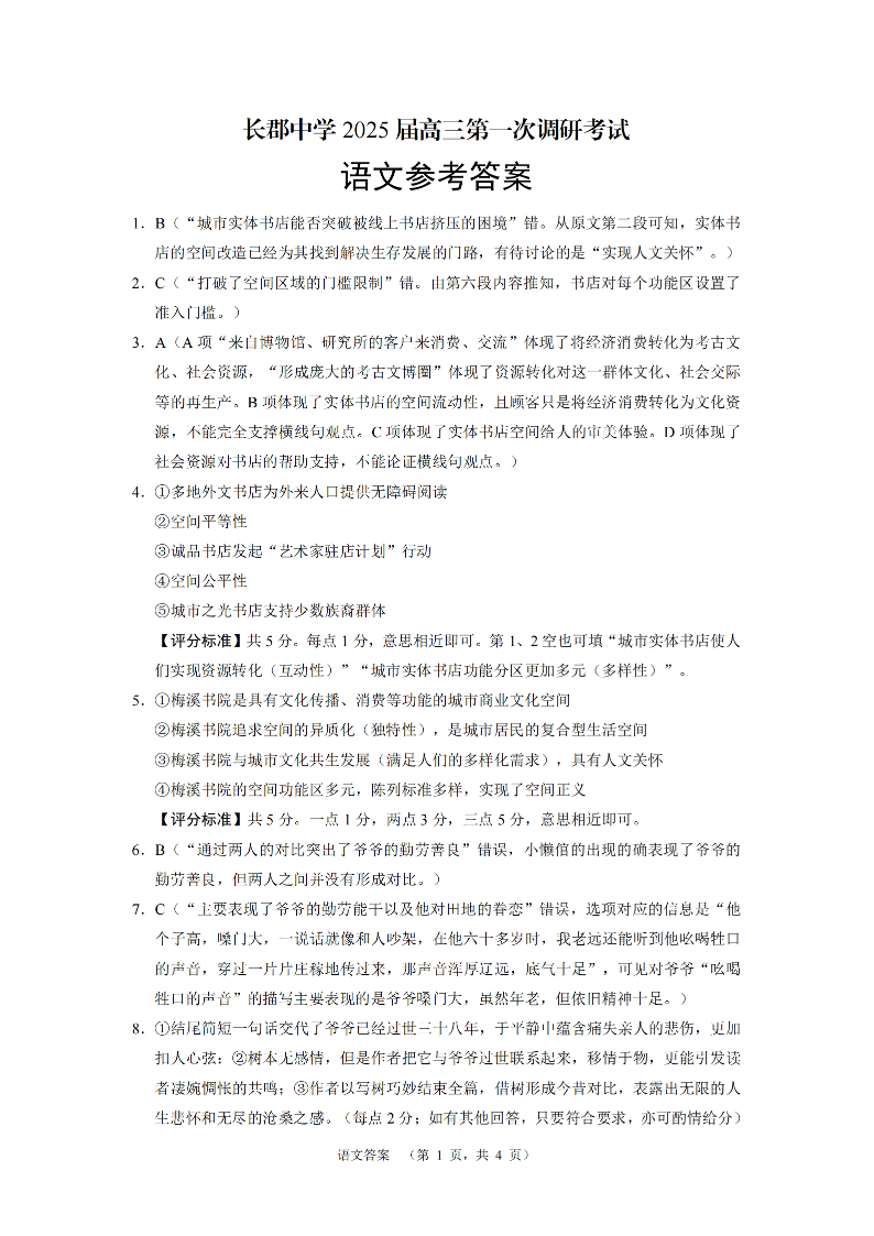 湖南省长郡中学2025届高三第一次调研考试 语文答案