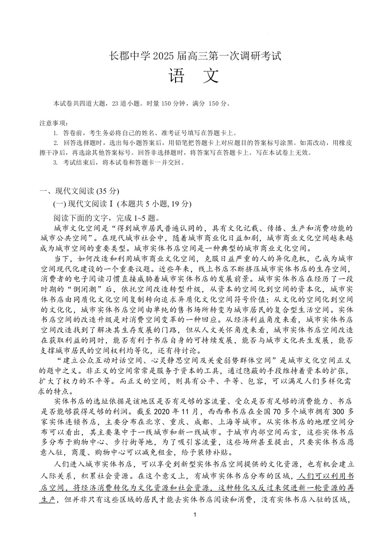 湖南省长郡中学2025届高三第一次调研考试 语文