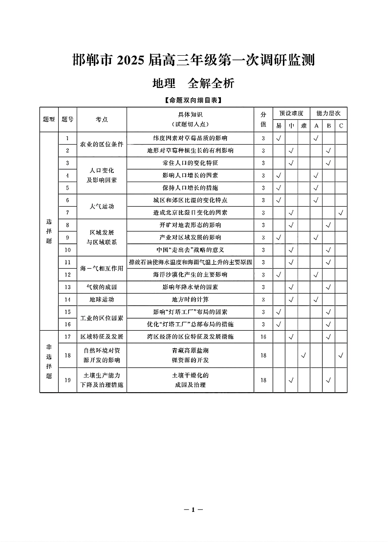 邯郸市2025 届高三年级第一次调研监测 地理答案