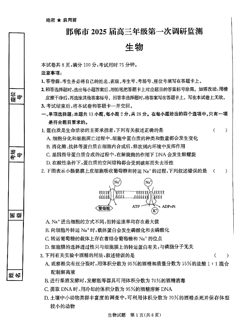 邯郸市2025 届高三年级第一次调研监测 生物