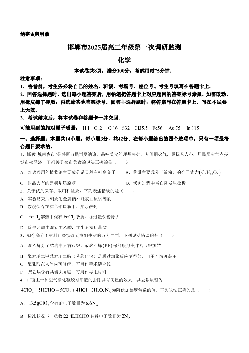 邯郸市2025 届高三年级第一次调研监测 化学