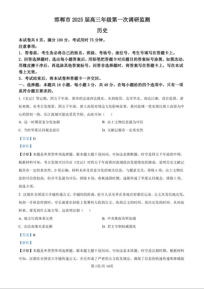 邯郸市2025 届高三年级第一次调研监测 历史答案