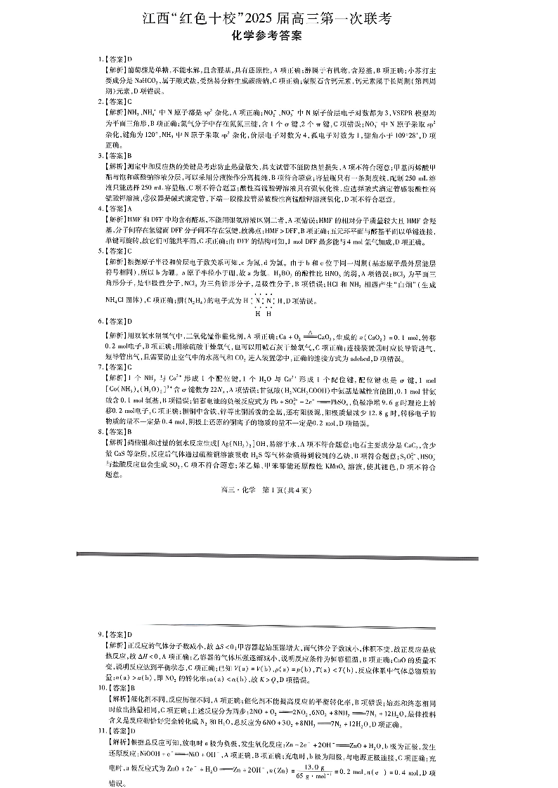 江西省红色十校2025届高三上学期第一次联考 化学答案