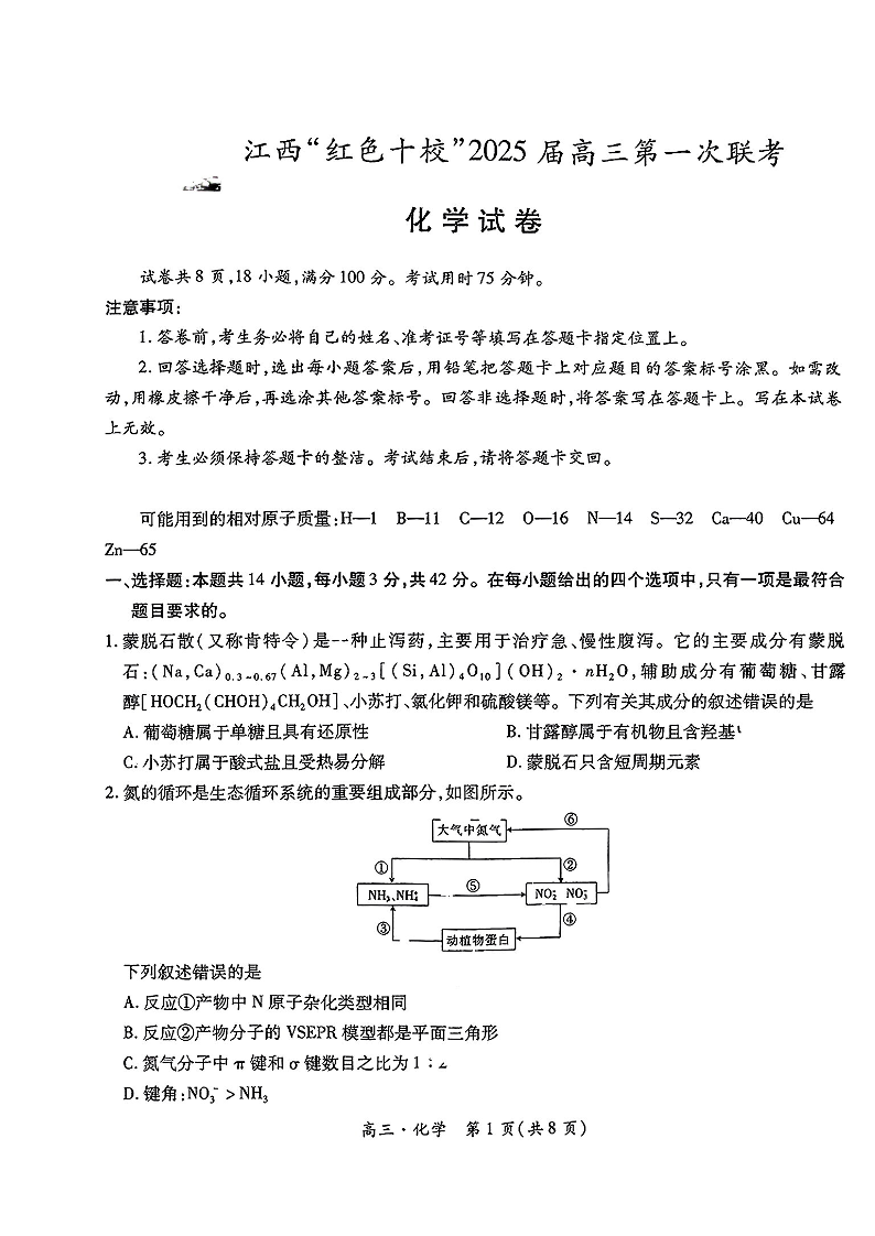 江西省红色十校2025届高三上学期第一次联考 化学