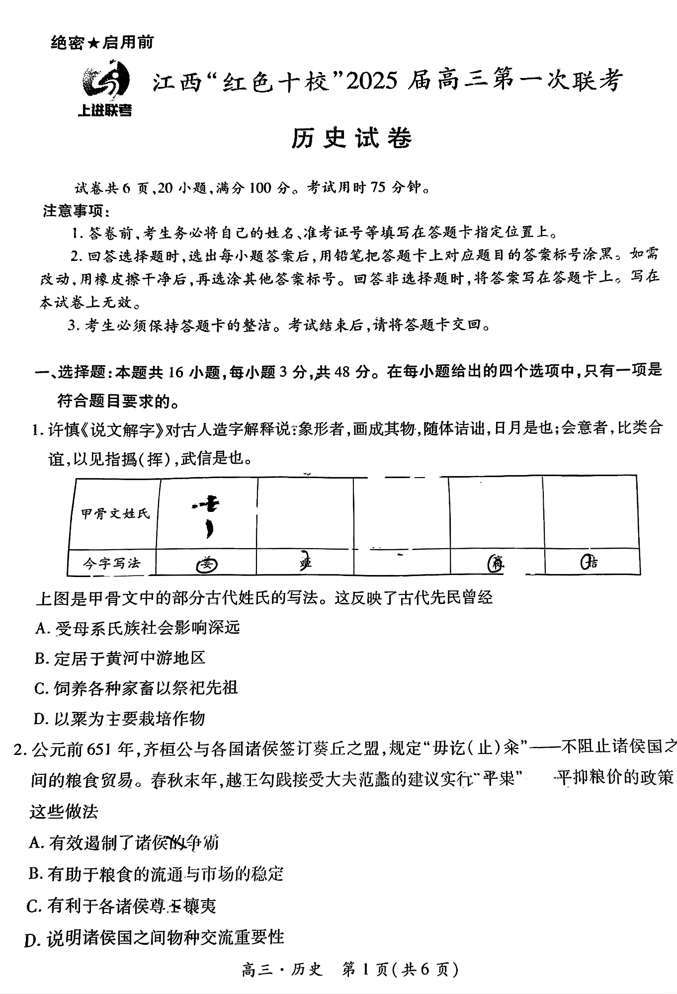 江西省红色十校2025届高三上学期第一次联考 历史