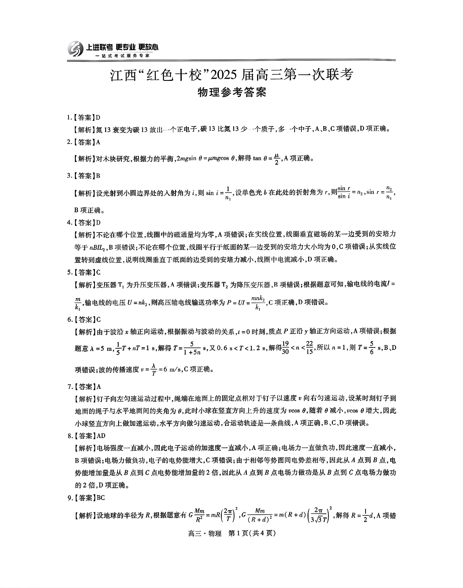 江西省红色十校2025届高三上学期第一次联考 物理答案