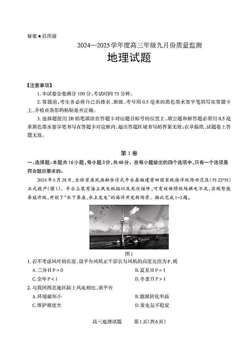 长治市2024-2025学年度高三年级九月份质量监测 地理