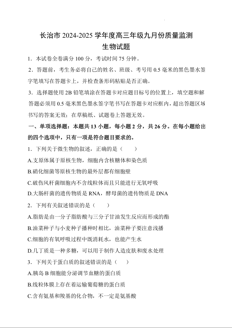 长治市2024-2025学年度高三年级九月份质量监测 生物