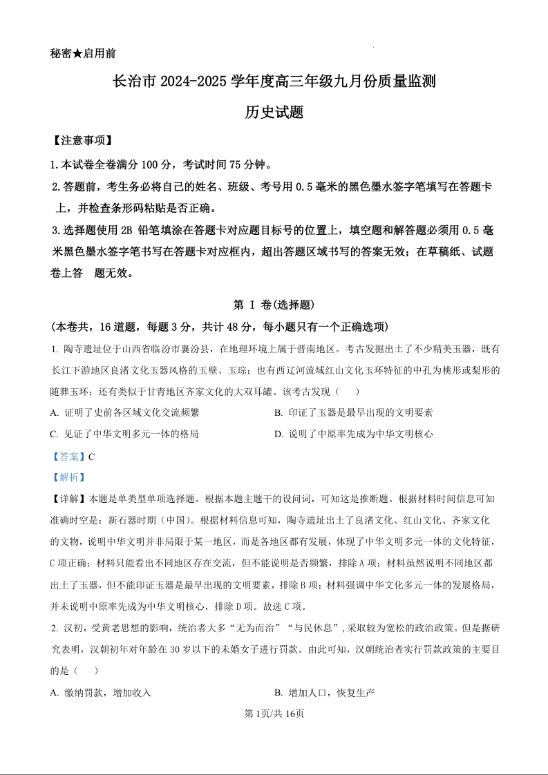 长治市2024-2025学年度高三年级九月份质量监测 历史答案