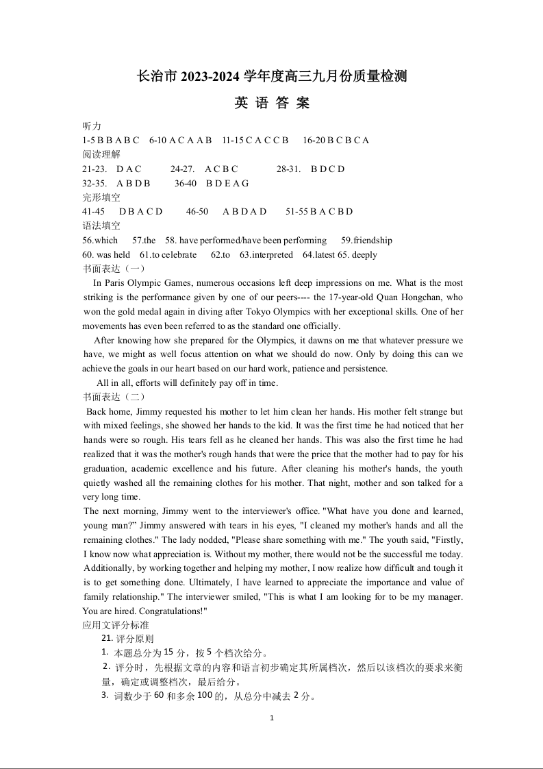 长治市2024-2025学年度高三年级九月份质量监测 英语答案