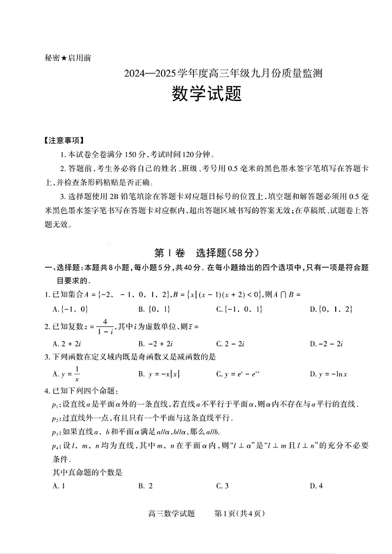 长治市2024-2025学年度高三年级九月份质量监测 数学