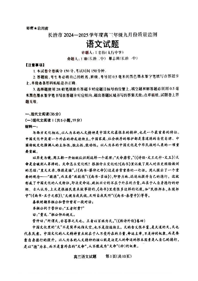 长治市2024-2025学年度高三年级九月份质量监测 语文