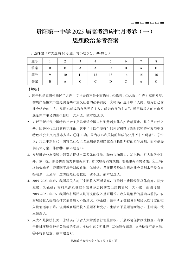 贵阳第一中学2025届高考适应性月考卷(一)政治答案