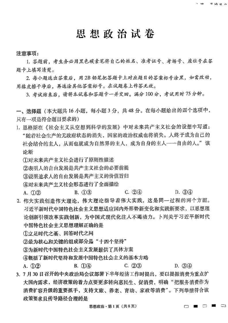 贵阳第一中学2025届高考适应性月考卷(一)政治