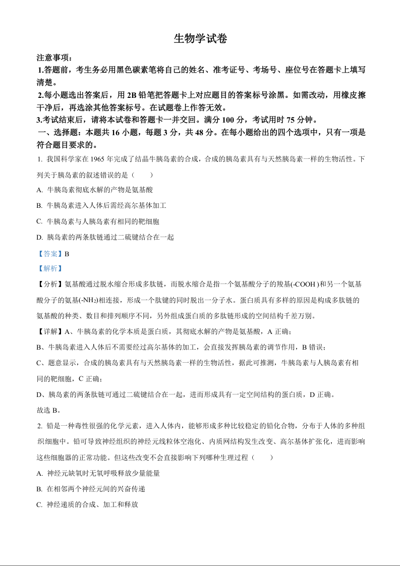 贵阳第一中学2025届高考适应性月考卷(一)生物答案