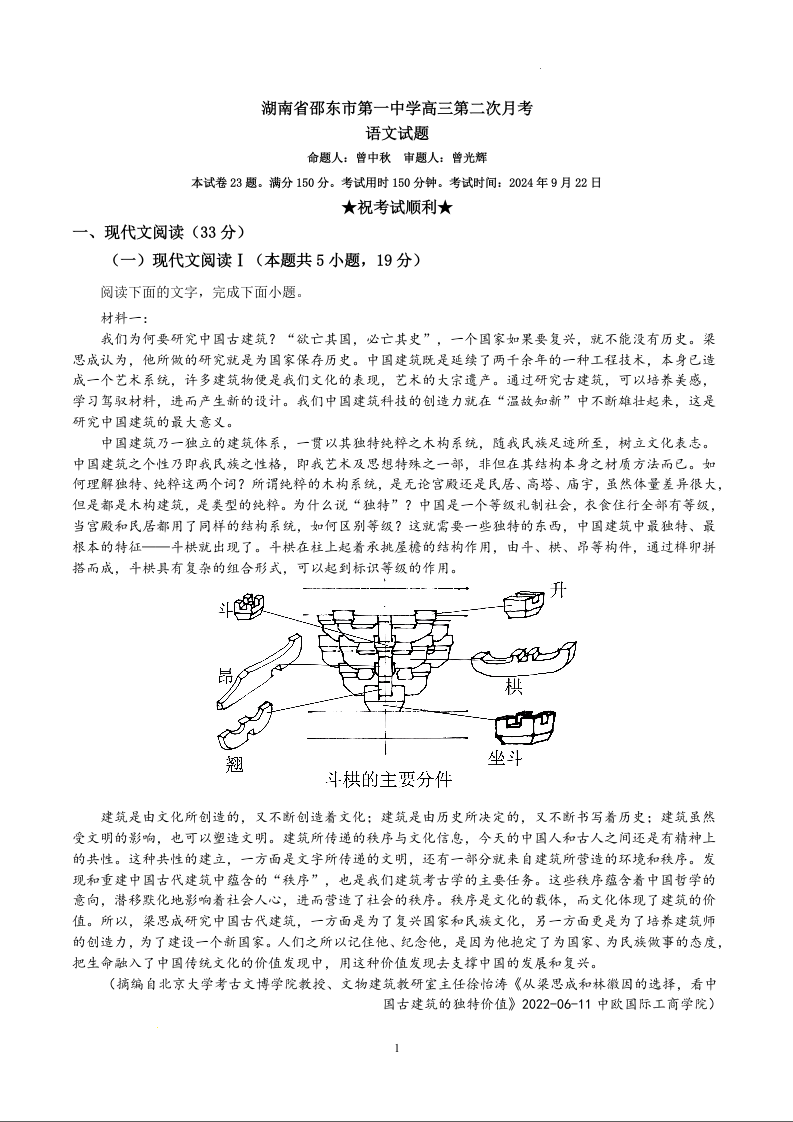 湖南省邵东市第一中学2025届高三9月第二次月考 语文