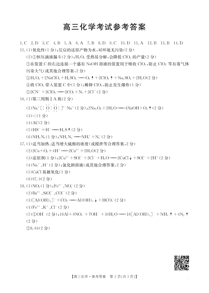 陕西省部分学校2025届高三9月联考 化学答案