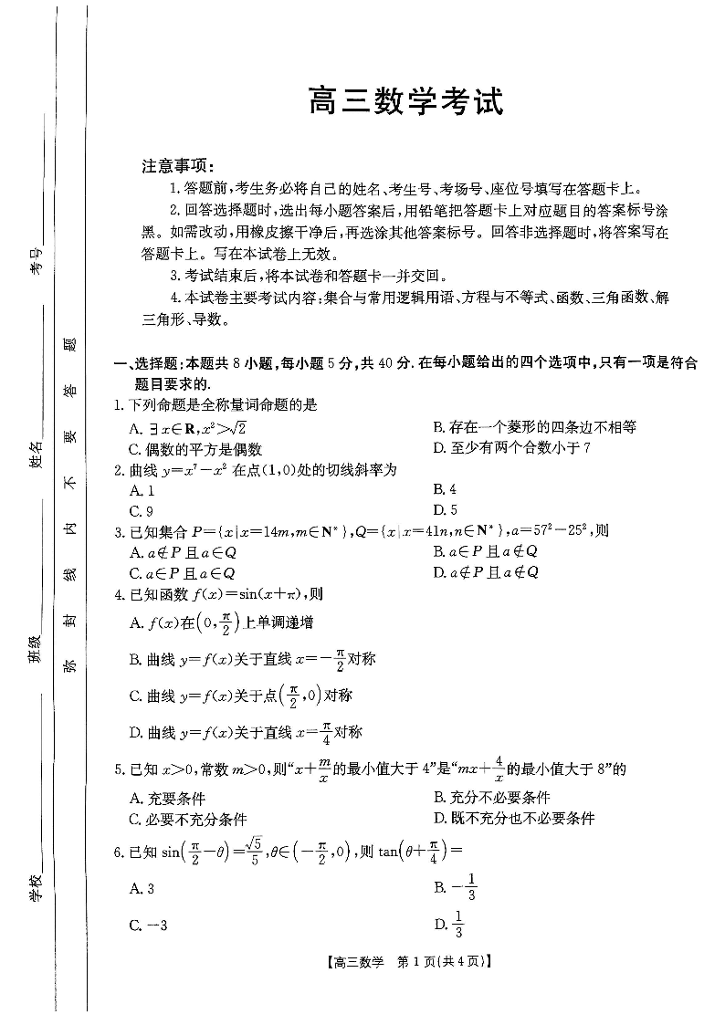 陕西省部分学校2025届高三9月联考 数学