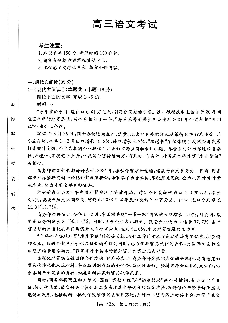 陕西省部分学校2025届高三9月联考 语文