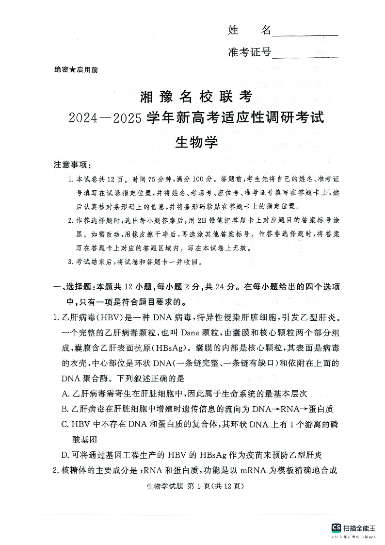 湘豫名校联考2024-2025学年新高考适应性调研考试 生物