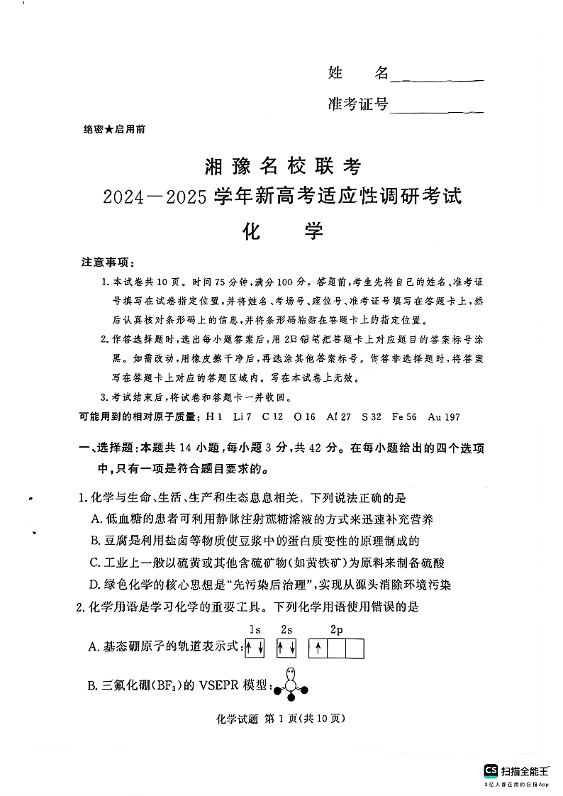湘豫名校联考2024-2025学年新高考适应性调研考试 化学