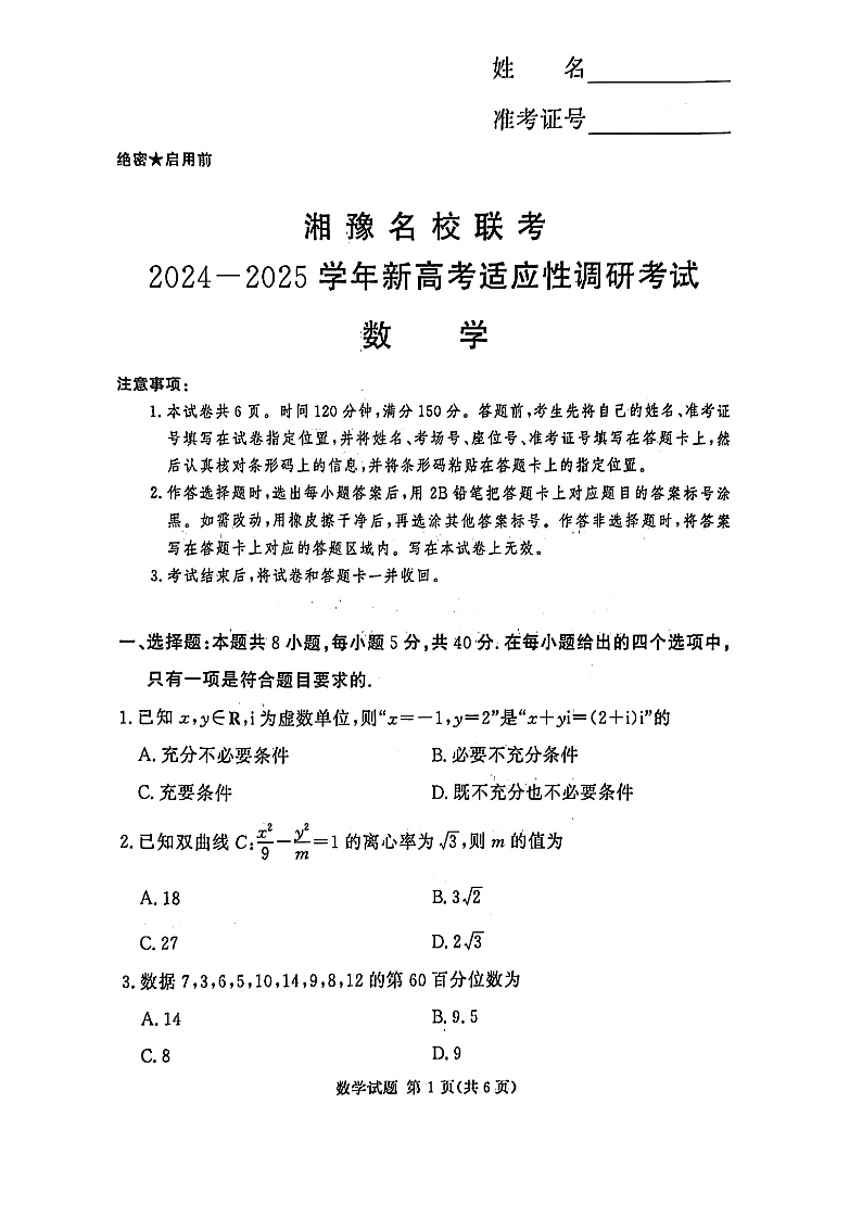 湘豫名校联考2024-2025学年新高考适应性调研考试 数学