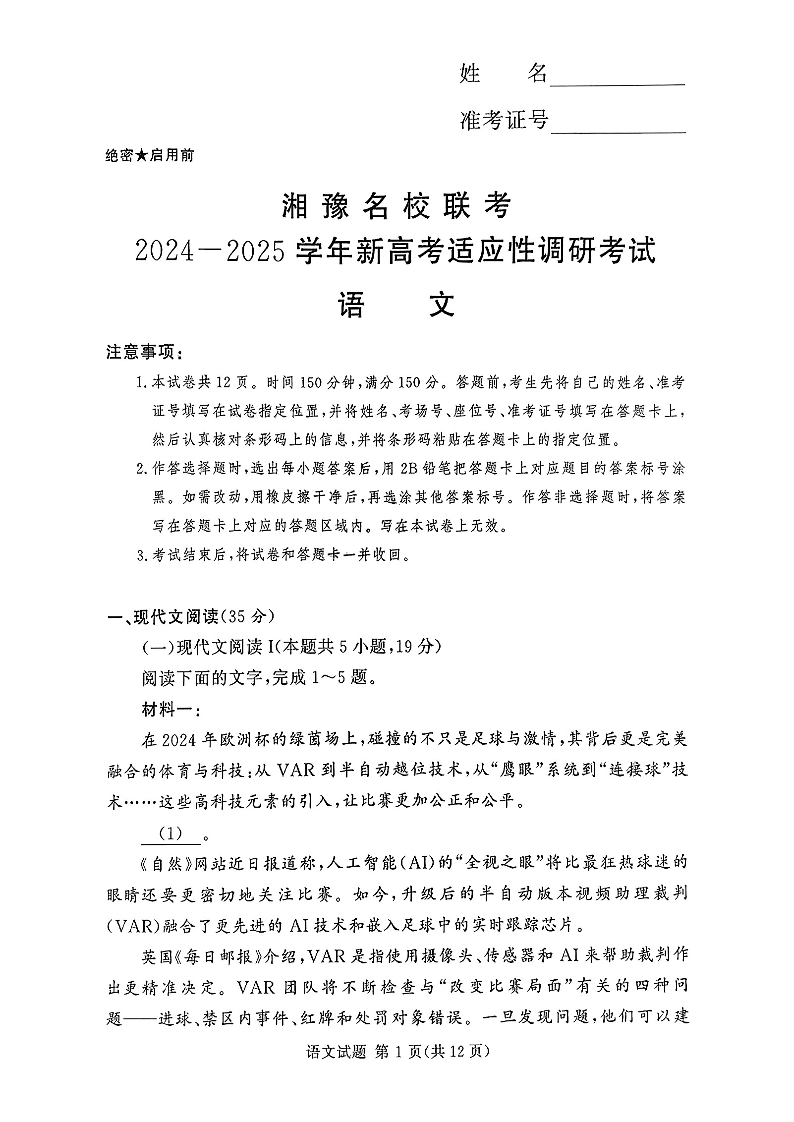湘豫名校联考2024-2025学年新高考适应性调研考试 语文