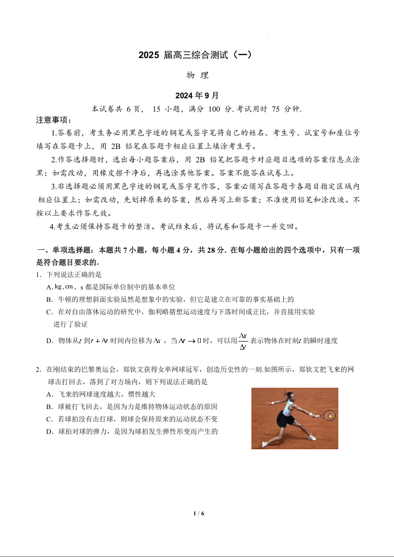 广东省华南师范大学附属中学2025届高三综合测试(一)物理