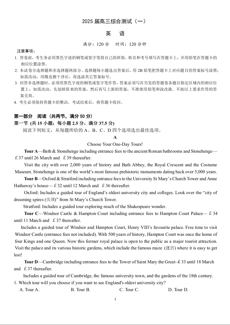 广东省华南师范大学附属中学2025届高三综合测试(一)英语