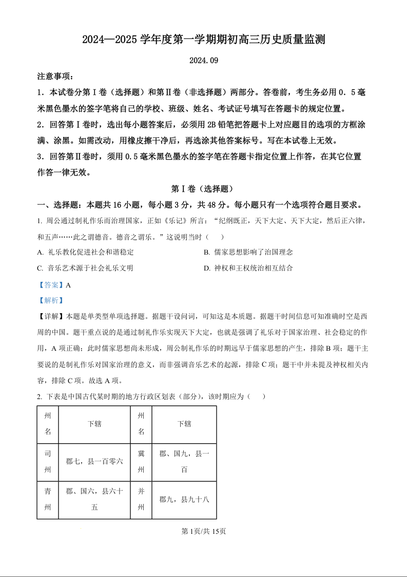 江苏省镇江市2024~2025学年第一学期期初高三质量监测 历史答案