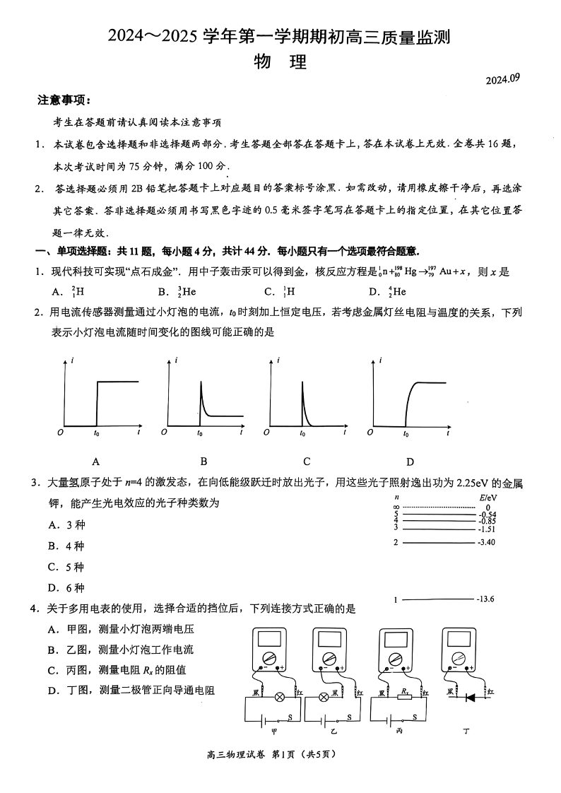 江苏省镇江市2024~2025学年第一学期期初高三质量监测 物理
